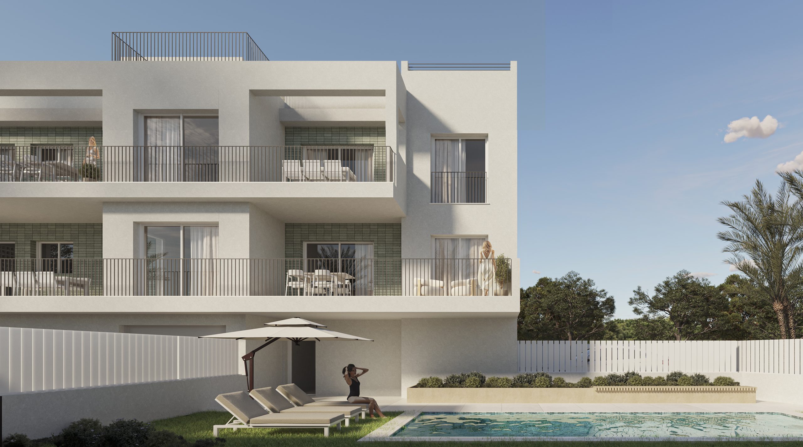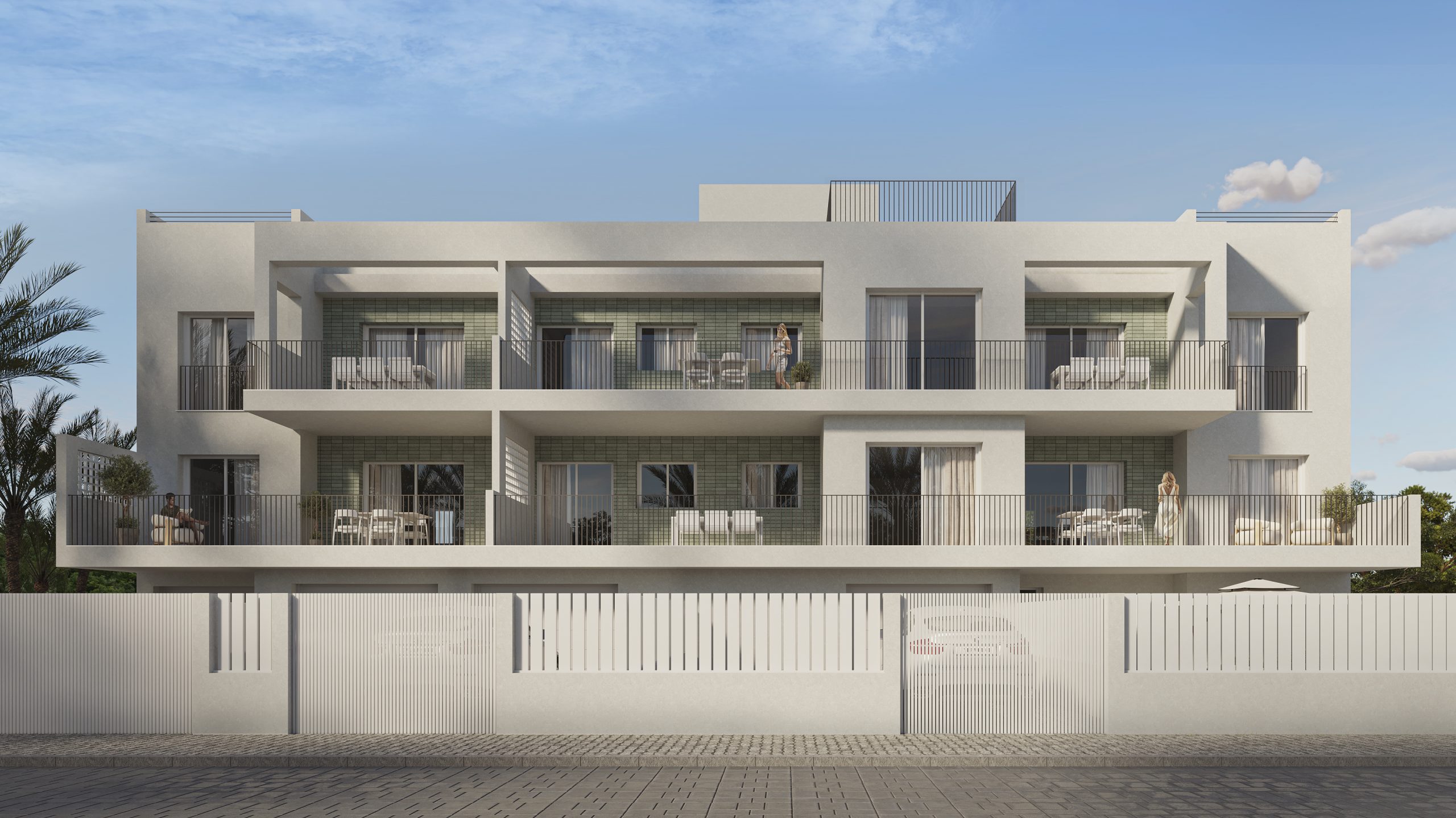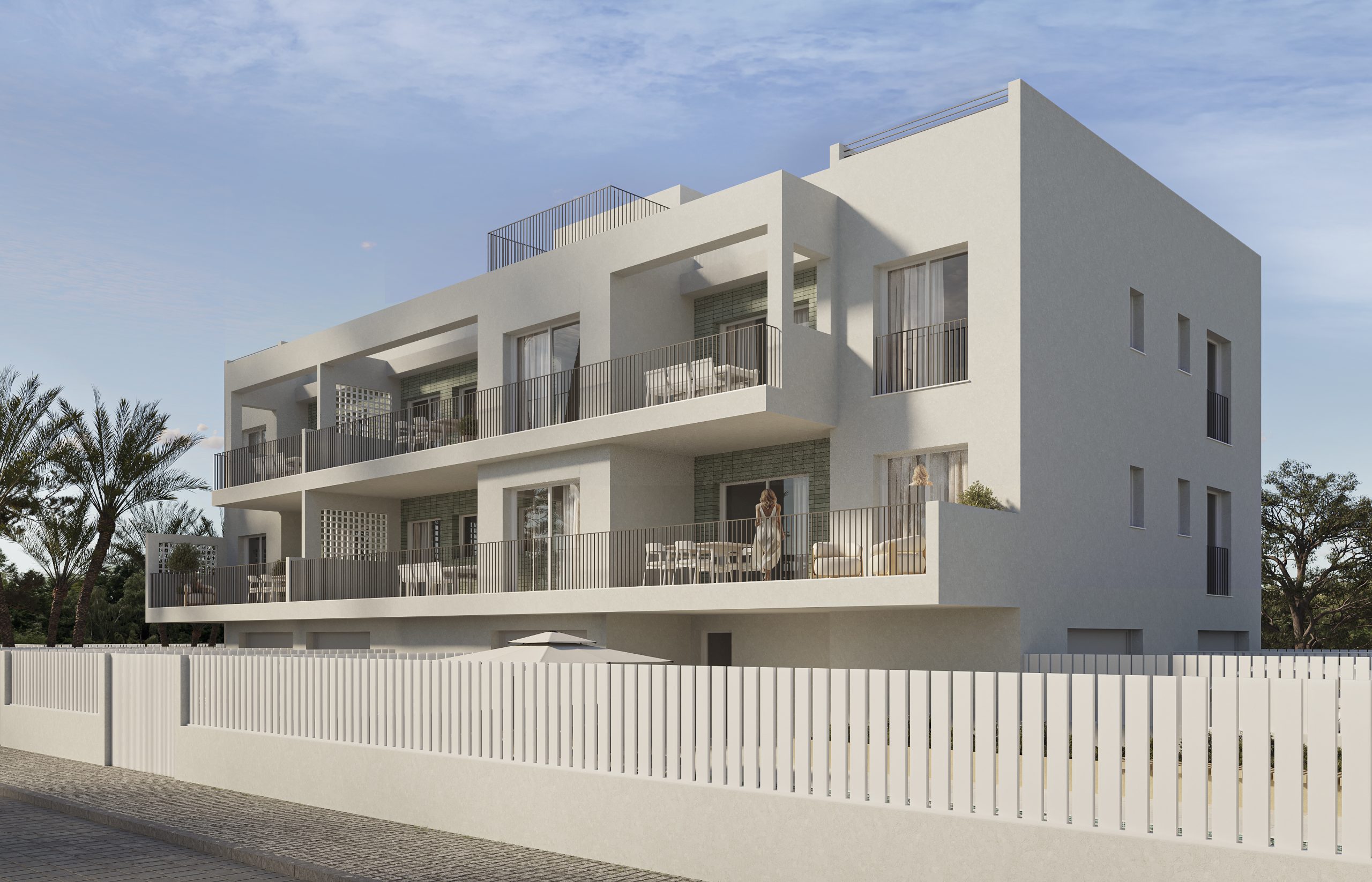 Esta visualización muestra un conjunto residencial situado en la Playa de Oliva, donde la arquitectura apuesta por la sencillez volumétrica, la funcionalidad y la conexión con el entorno. El edificio se resuelve mediante líneas puras y proporciones contenidas, reforzadas por una composición de huecos y terrazas que responden tanto al soleamiento como a la vida exterior.