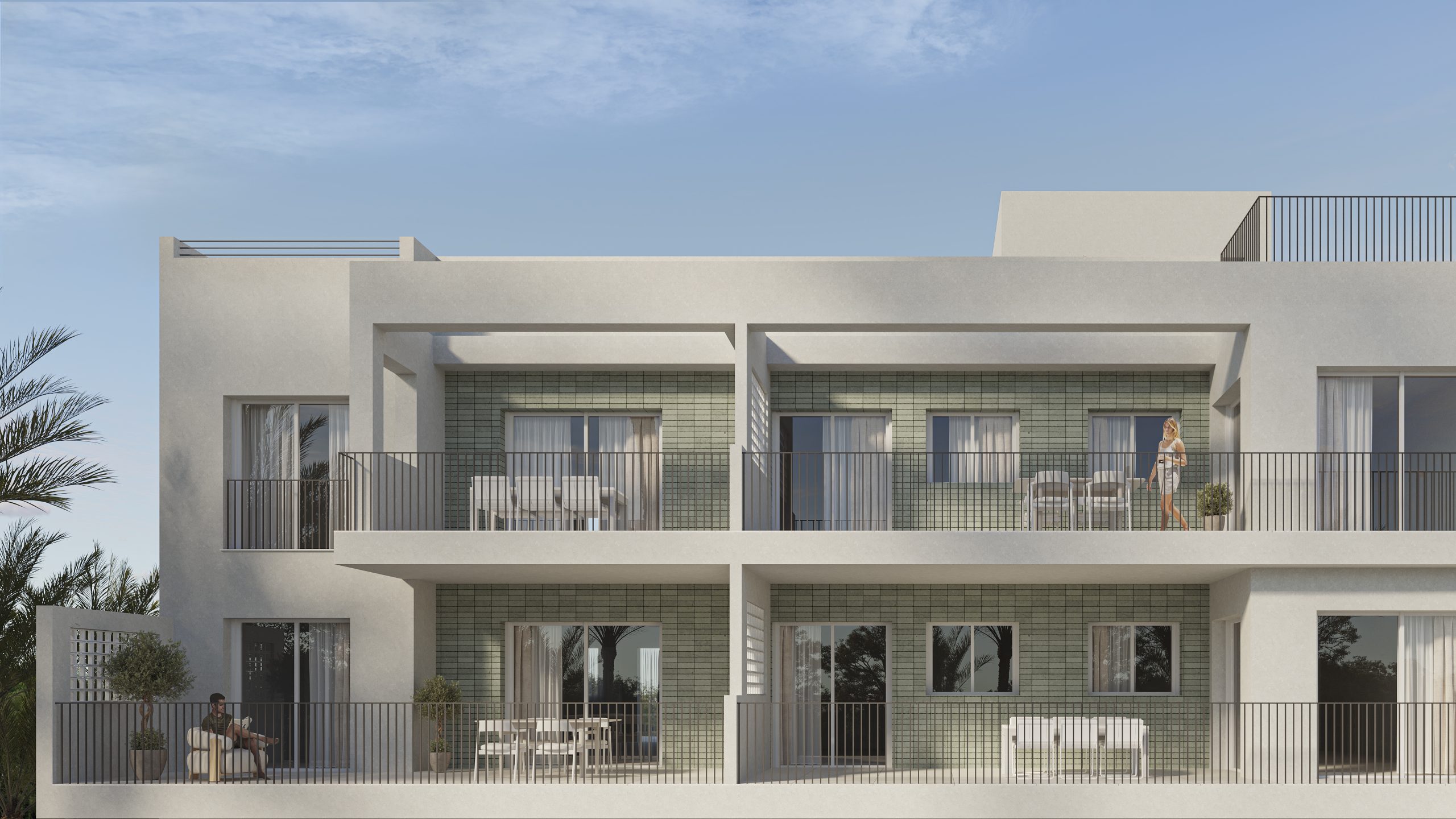 La paleta de materiales —revoco claro, celosías, cerámica texturada y carpinterías oscuras— remite a una estética mediterránea contemporánea, ligera y sobria, que busca durabilidad y confort. Las amplias terrazas y espacios intermedios permiten disfrutar del clima sin renunciar a la privacidad.
